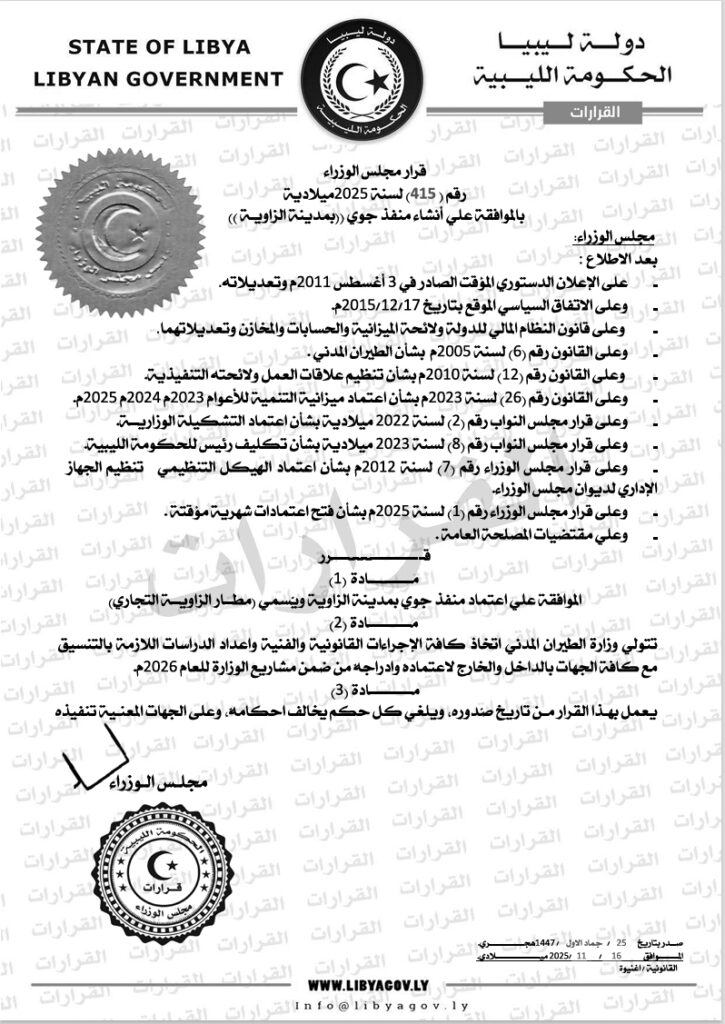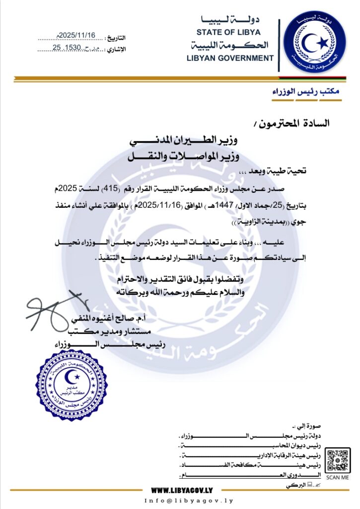 وجّه رئيس الحكومة الليبية، أسامة حماد، وزيري المواصلات والطيران المدني بحكومته، بإنشاء منفذ جوي داخل مدينة الزاوية، تحت مسمى مطار الزاوية التجاري.